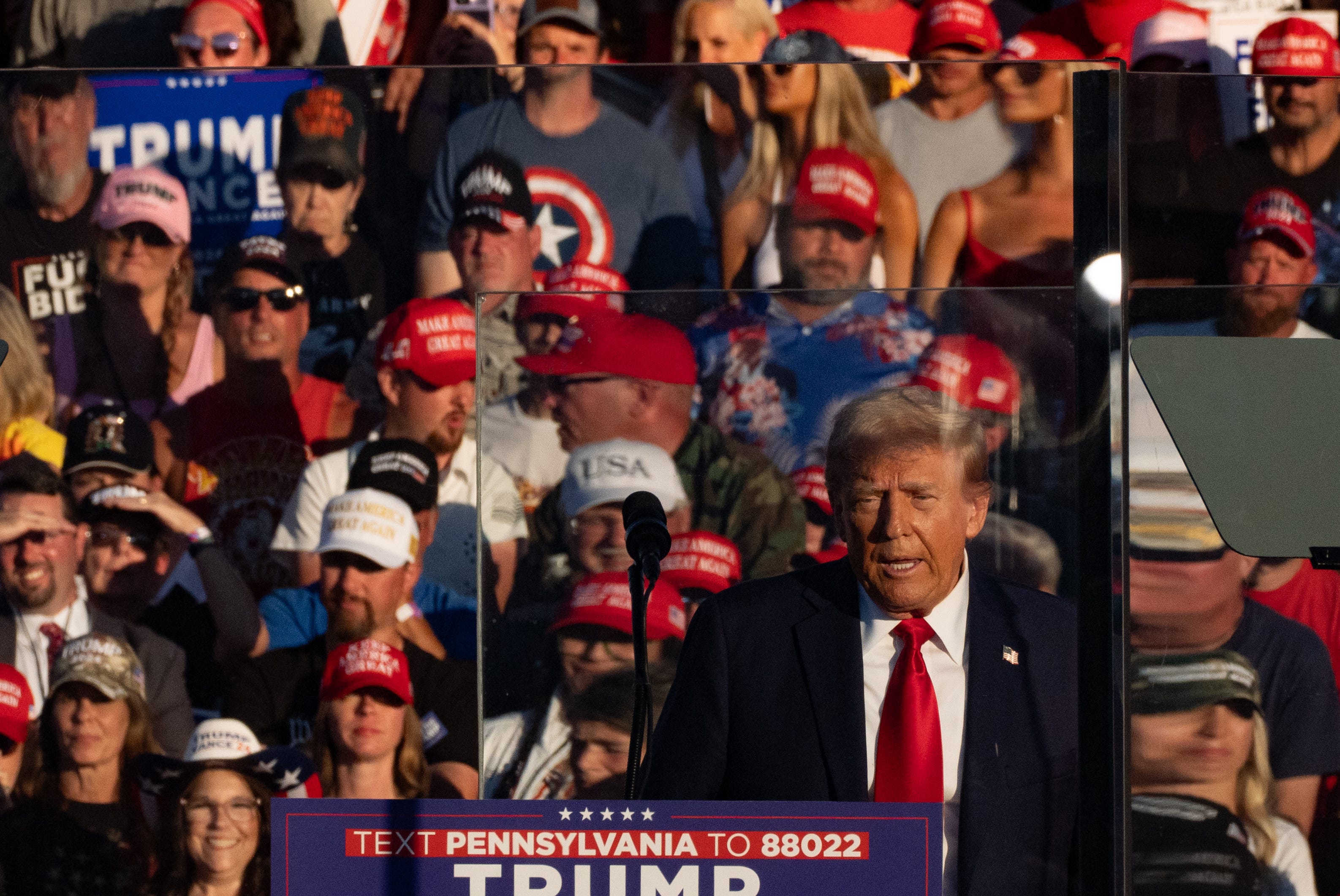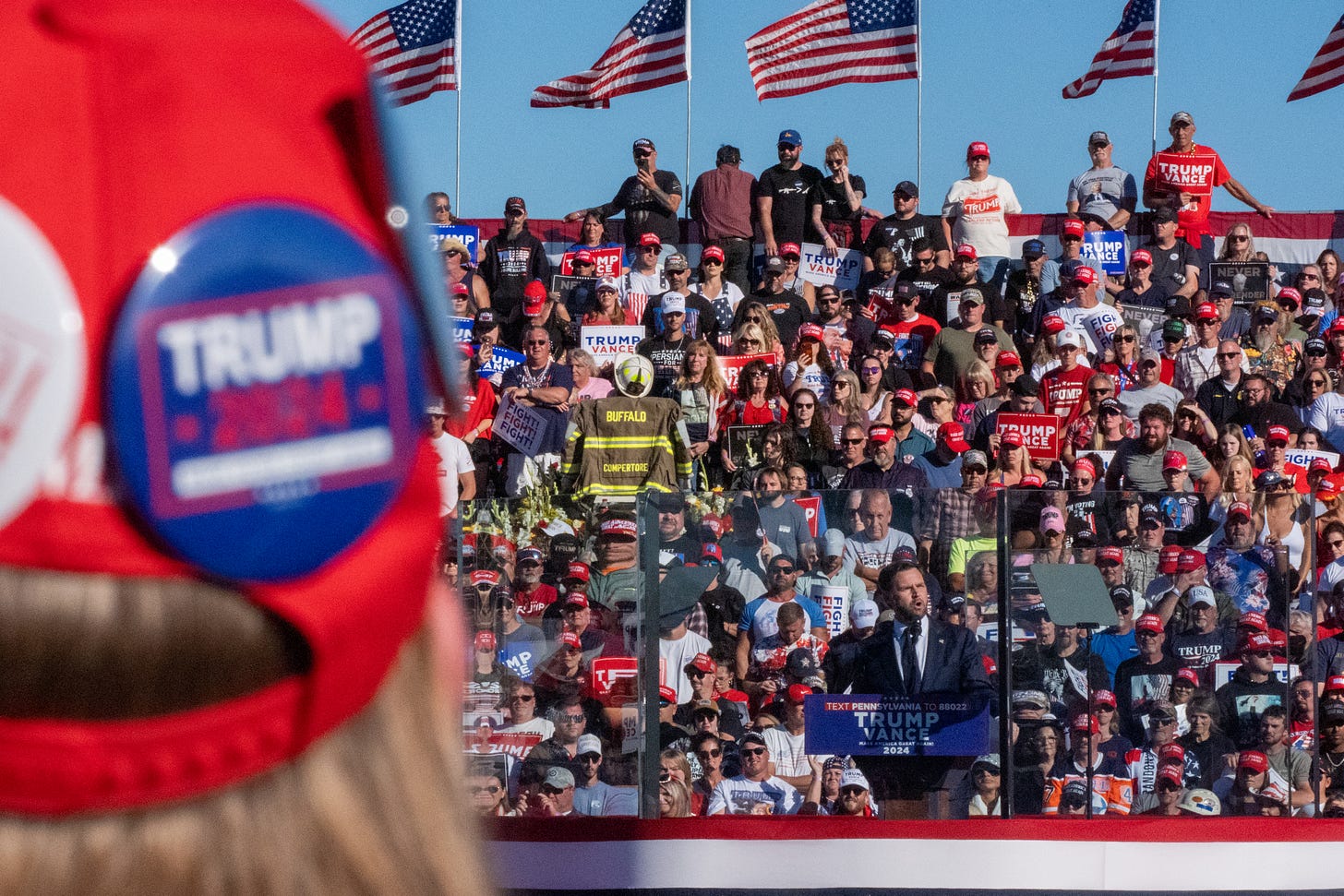 The campaign tried to deliver the experience people came for. Throughout the day, there were memorials to Corey Comperatore, the retired firefighter killed in the July shooting. His turnout gear was on display in the stands behind the speakers, and his family members attended.