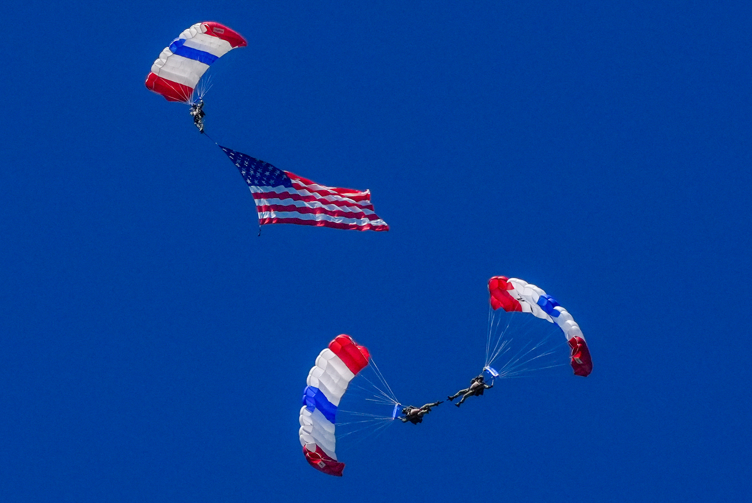 There was also more fanfare than usual. A skydiving team with a big American flag dropped in and Trump’s plane did a flyover while the theme from Top Gun played for the crowd.