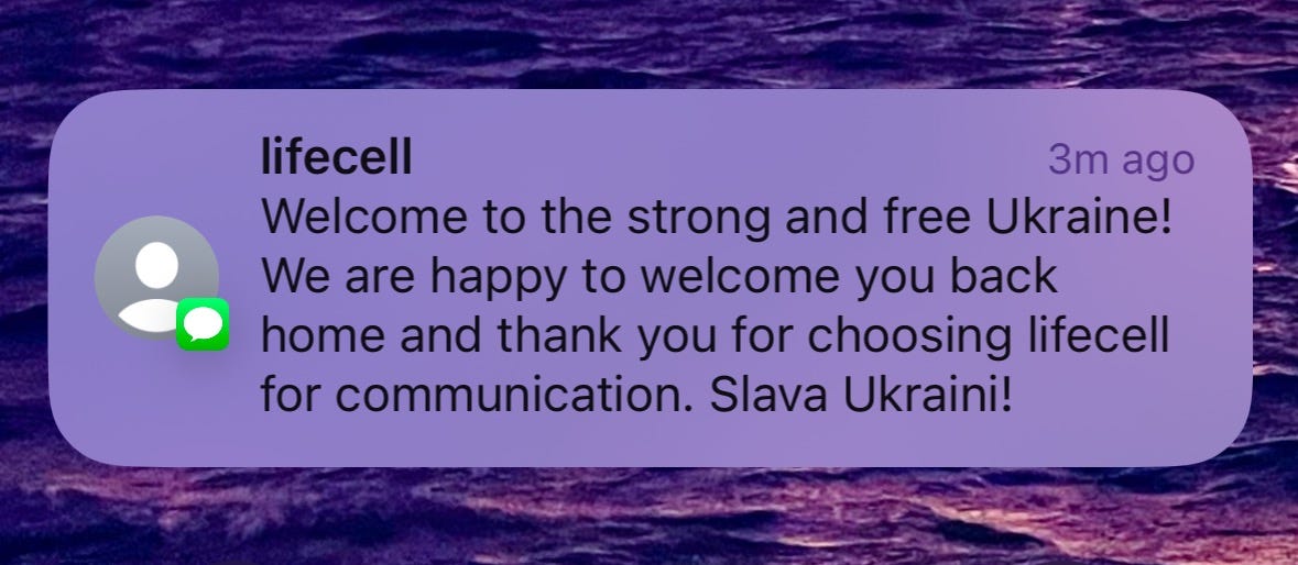 I have been trying to make my way here all year and today I succeeded. I have a Ukrainian SIM card for my phone, and when I crossed the border this morning, it showed me this message: