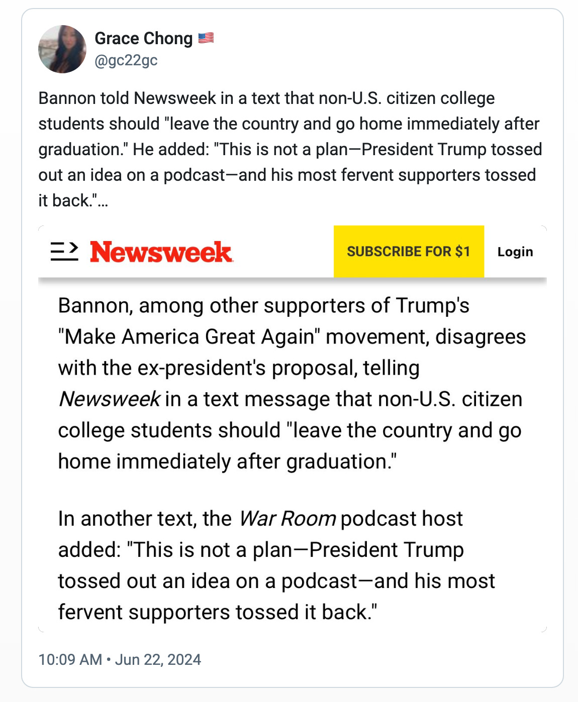 It will be interesting to see how Trump continues to play this. The in-group / out-group distinction is critical to the heart of the MAGA movement, and immigrants (except for Melania, apparently) are very firmly part of the out group. One hint of how this might go is that Trump will keep up this line to appeal to more mainstream voters, while he has others tell the MAGA base that he doesn’t really mean it. This is already happening with Steve Bannon who is arguing to the base that Trump does not seriously mean immigrants should get to stay. The discussions I saw around this were largely pro-Bannon.