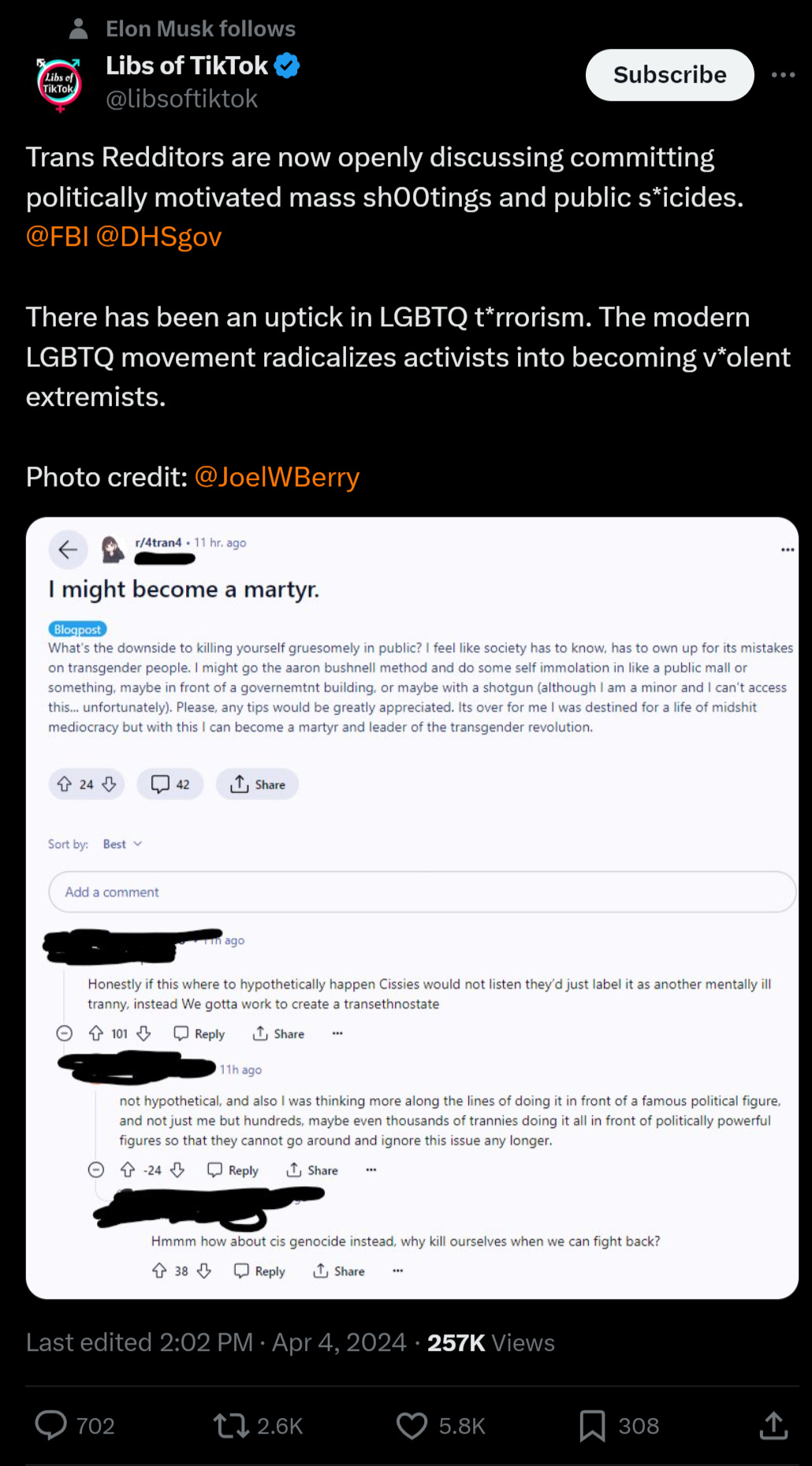 Threats against individuals or groups: A note from Jen: There are no significant threats today, but I wanted to discuss a meta issue here. I use ChatGPT to help summarize these discussions, but it’s still really important that I read them and monitor the summaries. Today, ChatGPT generated pretty scary text for this threats section. For example, this line was in the summary: “There are also discussions about potential violent actions, such as mass suicide events and using violence against transgender individuals.” This is incorrect. There was a discussion about this awful LibsOfTikTok post which, in turn, includes an upsetting discussion from reddit. There are no threats from the MAGA community (nor the trans community) about mass violence or suicide, but it’s hard for an automated tool to tease that out. There was a lot of discussion on this post, so to ChatGPT it looked like a lot of talk about violence; AI couldn’t pick up the context and incorrectly interpreted it as threats from the MAGA community. (That said, the discussion around this post was as awful and anti-trans as you might imagine.)