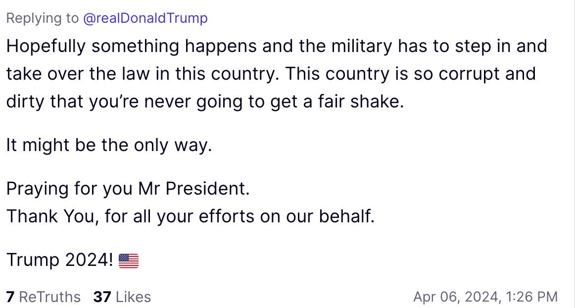 But a couple days ago, he posted a long screed about Judge Merchan and the gag order Trump is under in New York. As part of that, he wrote ominously, “How many Corrupt, Biased, Crooked Joe Biden-’Protection Agency’ New York Judges do I have to endure before somebody steps in?” We have seen this kind of thinly-veiled, plausibly deniable call for violence from Trump before (remember “Proud Boys, stand back and stand by”?)