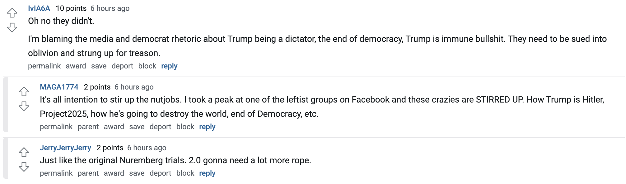 This is notable especially because there was a physical attempt to get to the media and harm them. While emotions were understandably high in that moment, the discussions on these forums make it clear that this strong, aggressive anti-media sentiment is a long-standing and enduring.