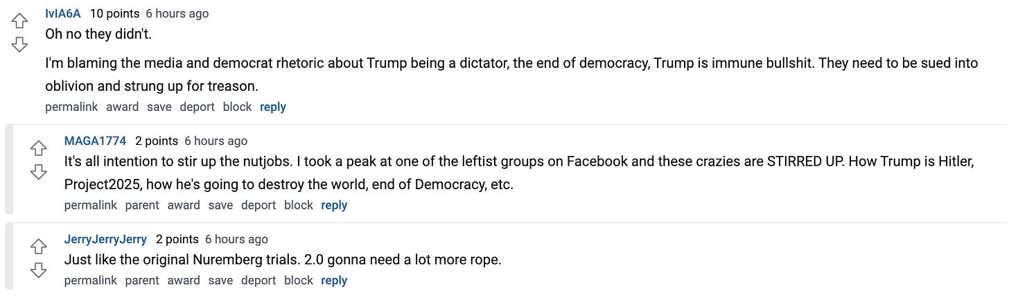 I cannot emphasize how, for months and months, the far-right pro-Trump forums have been precariously close to tipping into violence. They have been stopped because there was no order nor mission, but the situation has now changed. To avenge the attempt on Trump’s life is their mission, and with anything that feels like an instruction from Trump, many will finally commit the violence they have been lusting for. (I have a lot more to say about the psychology of this phenomenon, but I will save that for another edition of the MAGAReport).