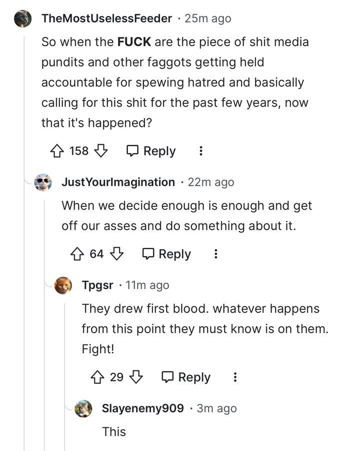 Instead of me interpreting the posts from the forum for you, it’s worth directly reading a few to get a sense of the anger, appetite for violence, and consensus. These aren’t just single posts that get no attention. They garner a lot of enthusiastic replies and agreement. Here are a few examples.
