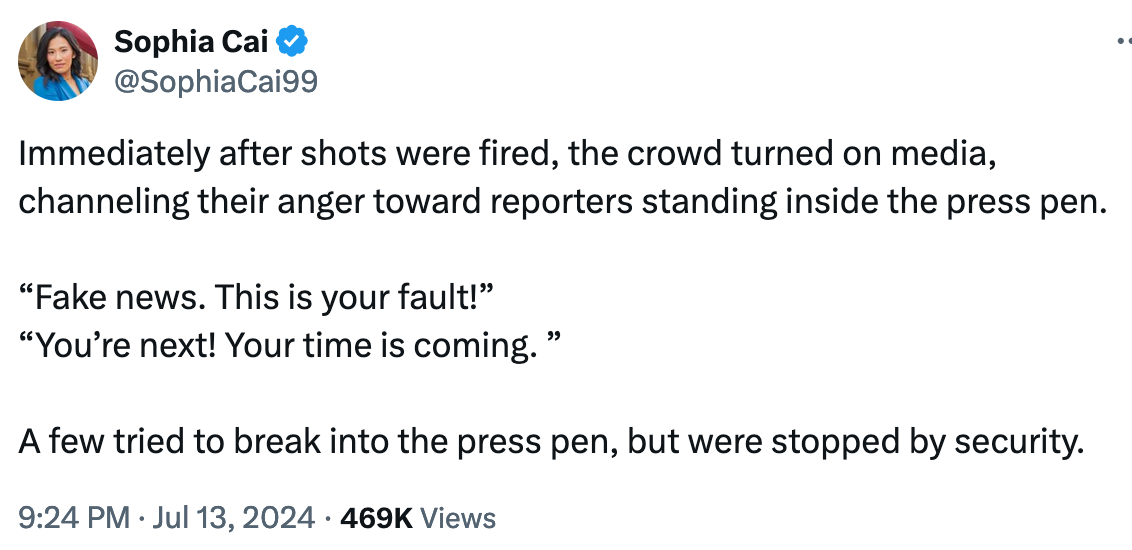 The specific threat I came away most concerned about was threats of violence against the media. Sophia Cai of Axios was at the rally has an excellent and chilling thread about what the journalists there experienced immediately after the shooting.