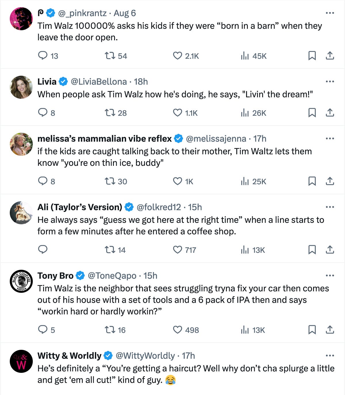 Yesterday, Vice President Harris announced Minnesota Governor Tim Walz was her pick for Vice President. This inspired celebration, hope, and some truly excellent memes on the left (do yourself a favor and when you need to cheer up, please read this post by David Hogg and the replies, a few of which I have included below to start things off joyfully)