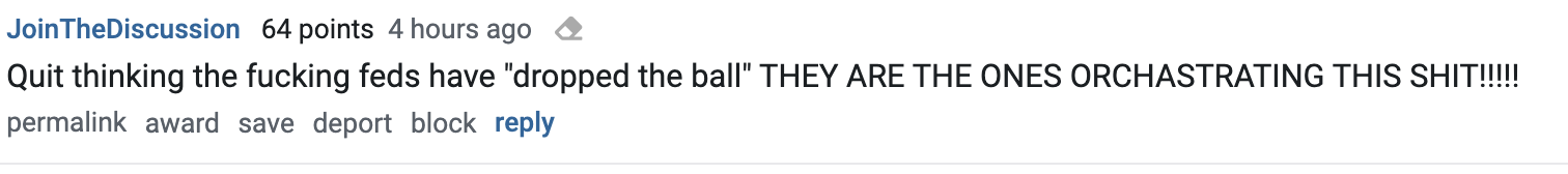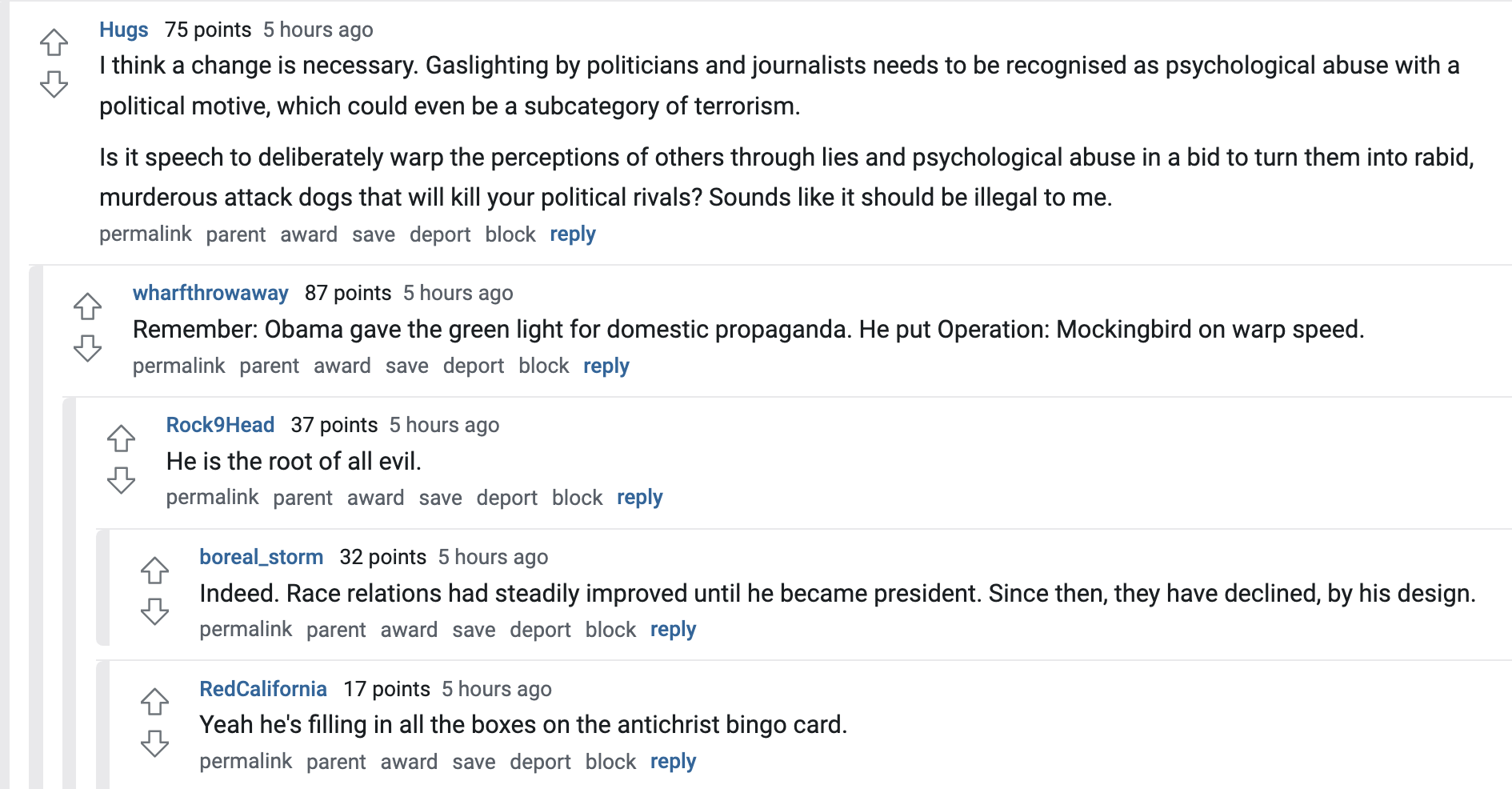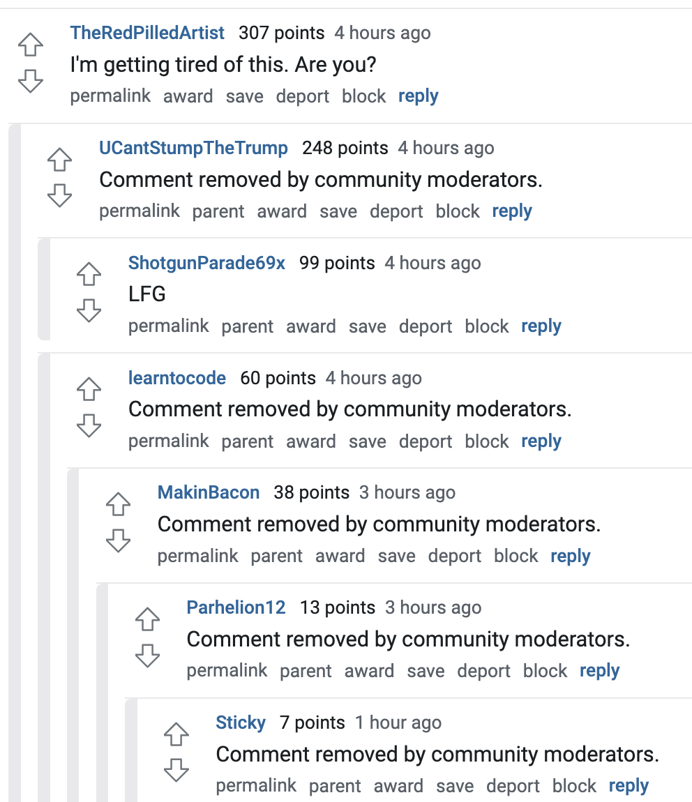 I read this next thread earlier tonight. See all these comments removed by moderators? These are comments so extreme that even a message board created for people who got kicked off reddit has decided the content is not appropriate. I read it before the moderators got to it, and the removed posts were calling for a 1989 Romanian revolution style execution of the existing heads of state.