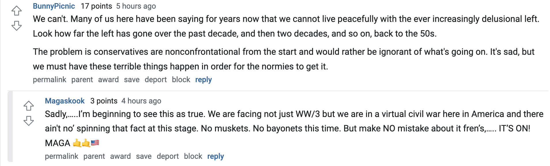 I have been writing all year about how there is a deep craving for violence among the far-right MAGA crowd. Incidents like this make them feel like they have justification to carry it out. We can see from all these comments how fascist politics (which I dive into here) underlies so much of MAGA extremism. They don’t just want to punish the person who tries to hurt Trump. They want all their enemies rounded up and put in camps or otherwise disappeared.