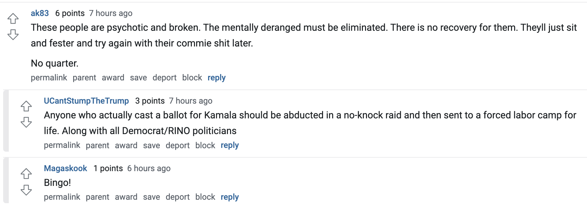 So we have calls for executing members of the party in power so explicit that this forum removed them. Then we also have calls for Trump to essentially create his own private security force: