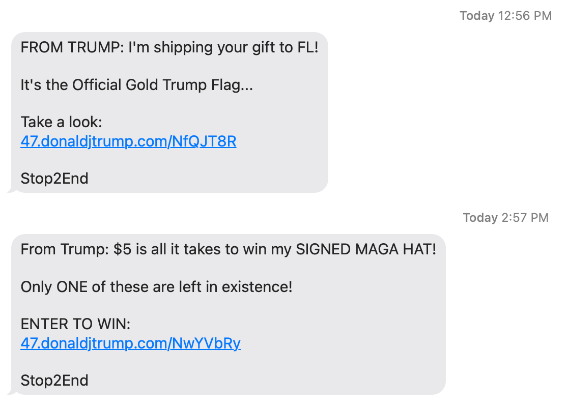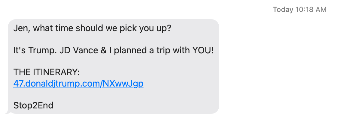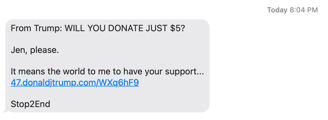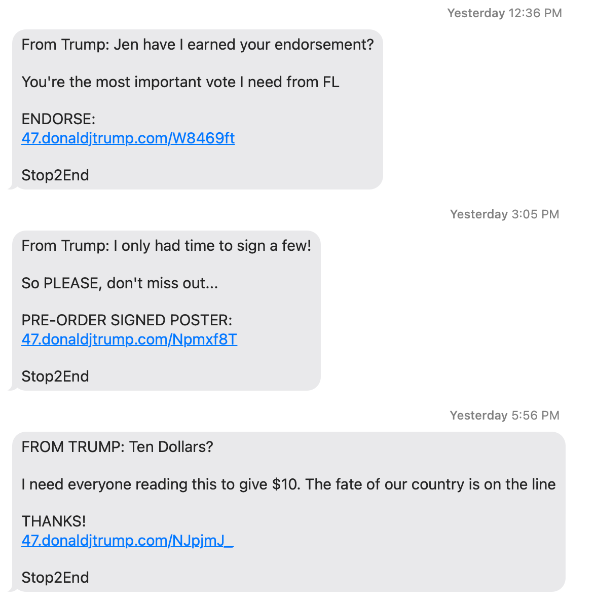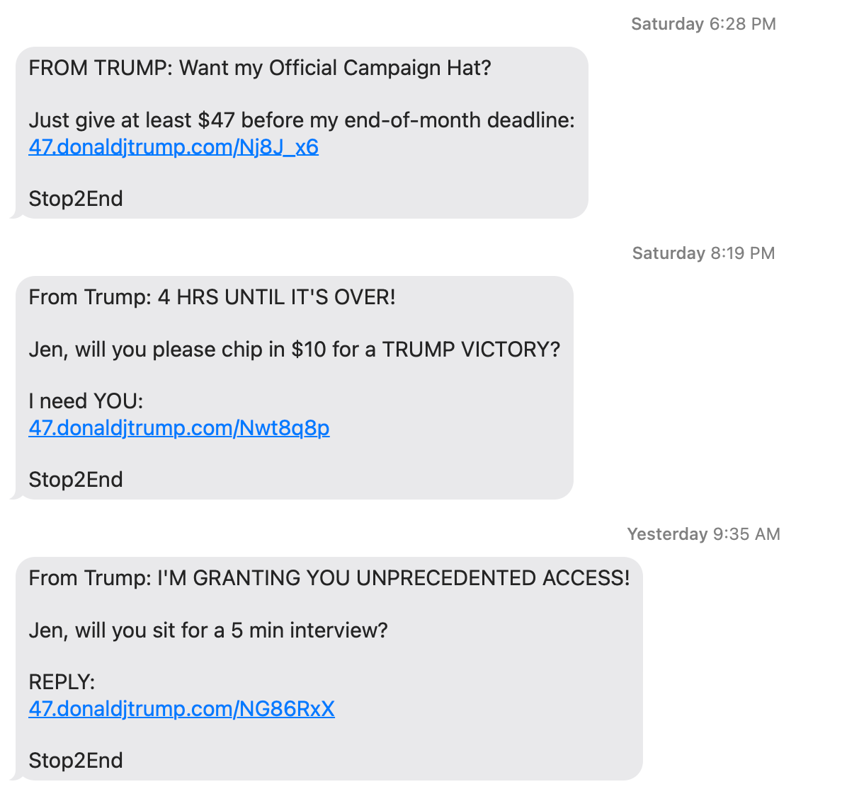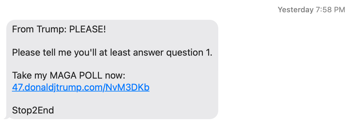Thanks for joining me for this tour of Trump texts! And please don’t be like Trump - if they don’t text back after 2 messages, it’s time to leave them be.