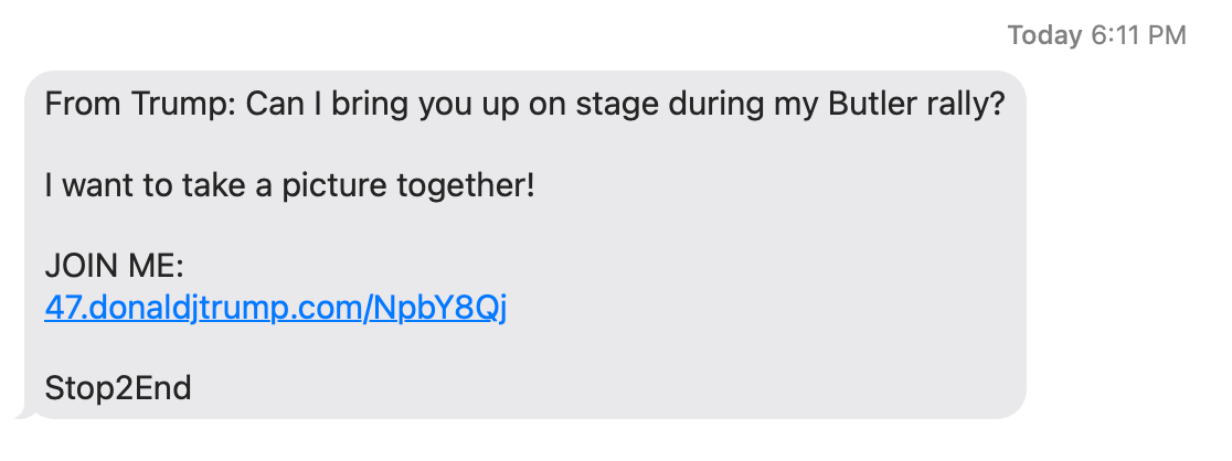 An interesting thing about this next one is that, as of the time of writing, there is no Butler rally on the schedule. Is this an old text from July that got stuck before that ill-fated rally and just made it to me? Or do I have a scoop about a new rally planned for Butler? (I clicked the link but there’s no information about the event)