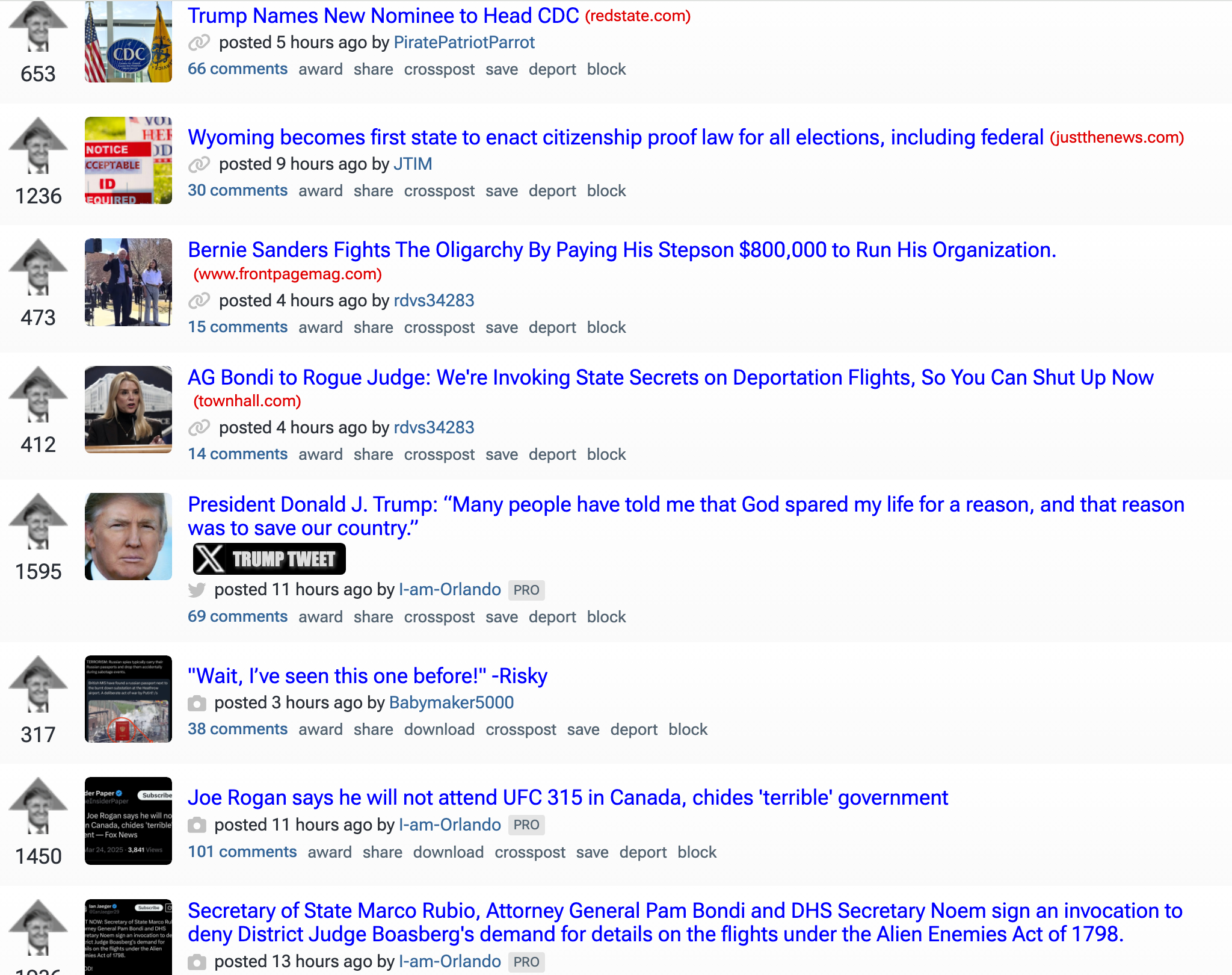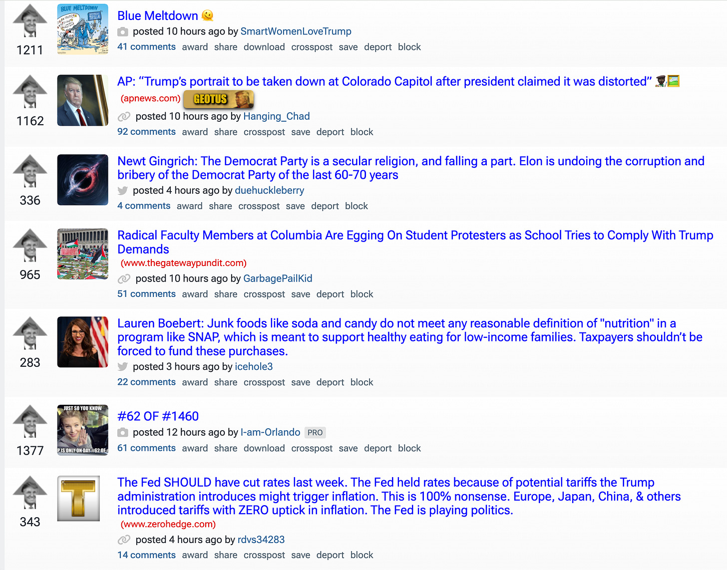The MAGA forums closely follow the news but if you checked there for SignalGate reactions, it would be as though it didn’t exist. I put the first four screens of the forum home page at the bottom of this post and you will see none of them mention the story. On the fifth page there’s a reference, but only through a meme about what a Democratic group chat would look like. Basically, it’s absent from the discussion.