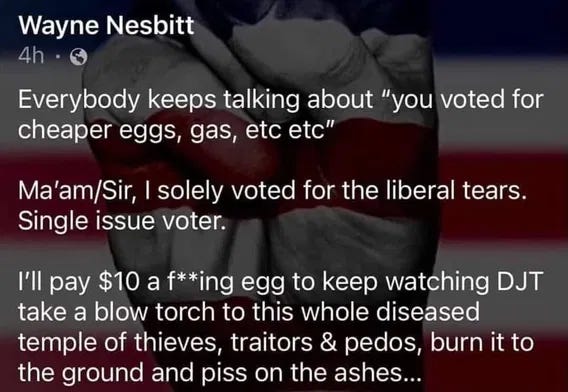 Now that Trump has won, plenty of supporters publicly have celebrated his victory and brought their MAGA hats out. Still, they have not fully come out and honestly told us why they voted for him. But the real reasons were there at all the rallies, in all the cheers, in all the interviews. They voted for him because they wanted to destroy everything and see their enemies suffer. They were smart enough to know that wasn’t acceptable, so they made up stories to explain their vote. “Inflation” just sounded better.